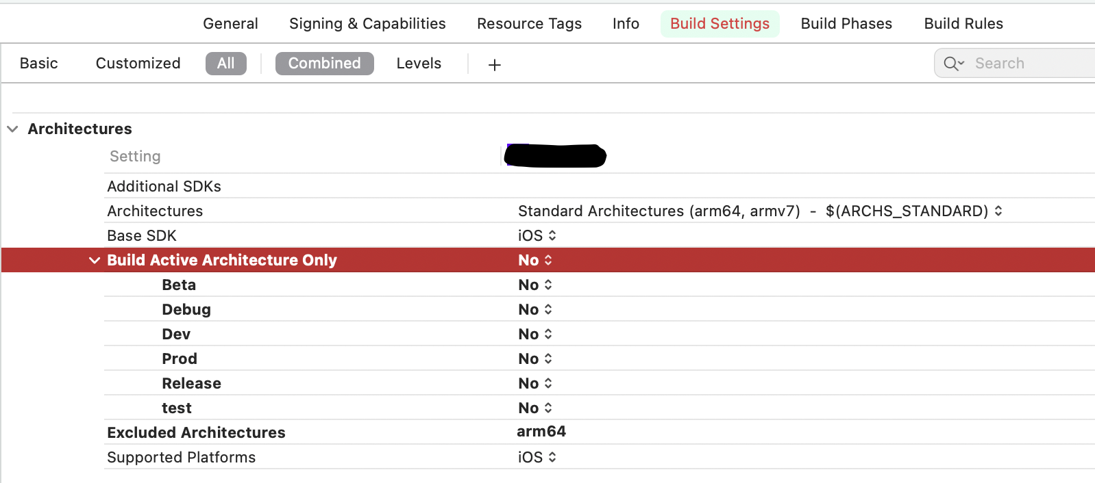2. Build Settings -> Architectures -> Build Active Architecture Only ๋ฅผ ์ ๋ถ "NO"๋ก ์ค์