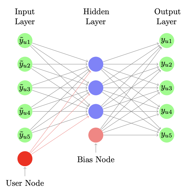 CDAE는 DAE랑 비슷하게 1개의 hidden layer로 구성된 nerural net인데요, 차별점은