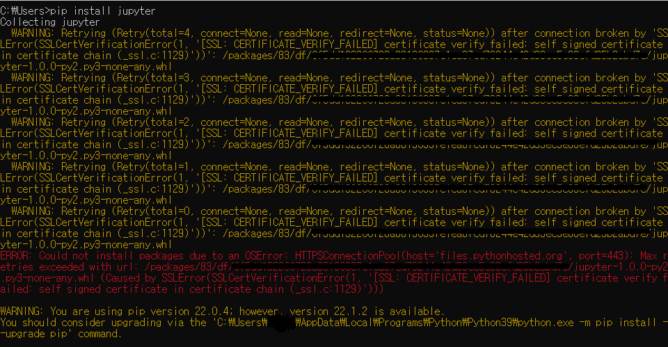 pip install jupyter ๋ก ์ฅฌํผํฐ ๋ ธํธ๋ถ ์ค์นํ๋ คํ๋๋ฐ ๊ณ์ ๋ค์๊ณผ ๊ฐ์ ์๋ฌ๊ฐ ๋ณ๋ค