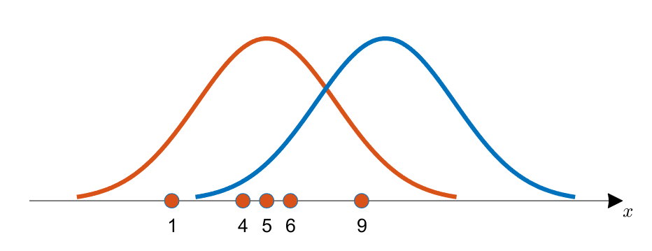 ์์น์ ์ผ๋ก ์ด ๊ฐ๋ฅ๋๋ฅผ ๊ณ์ฐํ๊ธฐ ์ํด์๋ ๊ฐ ๋ฐ์ดํฐ ์ํ์์ ํ๋ณด ๋ถํฌ์ ๋ํ ๋์ด(likelihood ๊ธฐ์ฌ๋)๋ฅผ ๊ณ์ฐํด์ ๋ค ๊ณฑํ ๊ฒ์ ์ด์ฉํ ์ ์๋ค. (์ด๋, ๊ณ์ฐ๋ ๋์ด๋ฅผ ๋ํ์ง ์๊ณ ๊ณฑํด์ฃผ๋ ์ด์ ๋ ๋ชจ๋ ๋ฐ์ดํฐ ์ถ์ถ์ด ๋ ๋ฆฝ์ ์ผ๋ก ์ฐ๋ฌ์ ์ผ์ด๋๋ ์ฌ๊ฑด์ด๊ธฐ ๋๋ฌธ์ด๋ค)