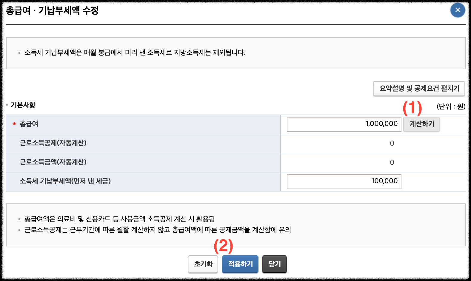 ์ด๊ธ์ฌ๋ฅผ ์ ๋ ฅํ์๊ณ ๊ณ์ฐํ๊ธฐ๋ฅผ ํด๋ฆญํ ํ์ ๋งจ ์๋ ์ ์ฉํ๊ธฐ ๋ฒํผ์ ํด๋ฆญํฉ๋๋ค.