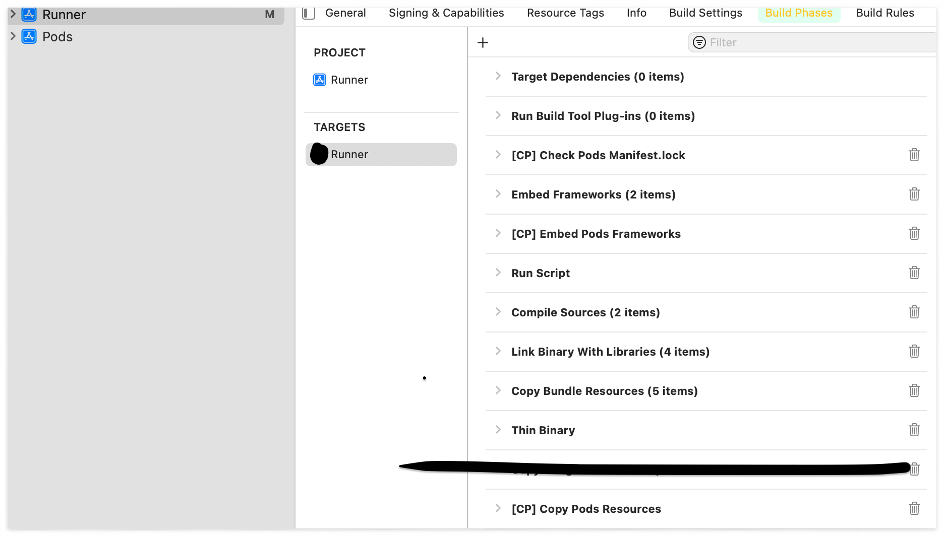 Runner์ buildPhases์์ ์์๋ฅผ ๋ฐ๊พธ๋ผ๋๊ฑฐ์๋ค.