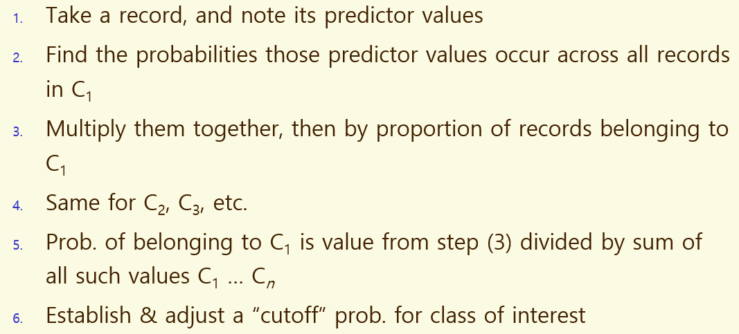 ํ๋์ record๋ฅผ ๋ถ๋ฅํ๊ธฐ ์ํด, ๊ฐ ์ง๋จ i์ ๋ํ P(Ci|X1,X2,...,Xp)๋ฅผ ๊ณ์ฐ -> ๊ฐ ์ง๋จ์ ์ํ ๊ธฐํ๋ฅผ ์ธก์ -> ๊ทธ ํ ๊ฐ์ฅ ๋์ ํ๋ฅ ๊ฐ์ ๊ฐ์ง๋ ์ง๋จ์ผ๋ก ๋ถ๋ฅ