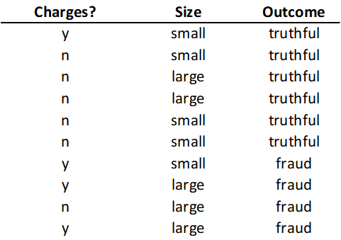 - P(fraud | charges=yes, size=small) = ½ = 0.50