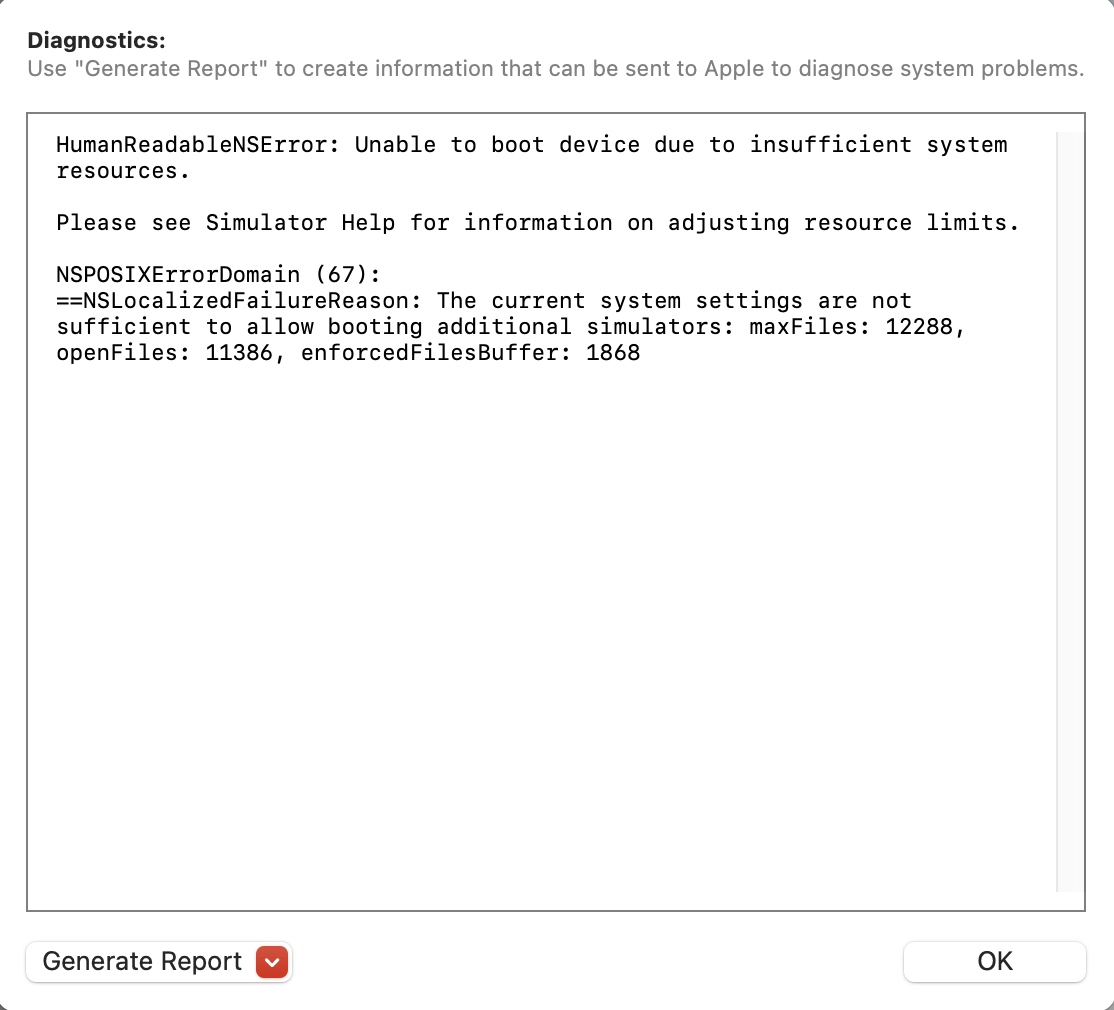 ==NSLocalizedFailureReason: The current system settings are not sufficient to allow booting additional simulators: maxFiles: 12288, openFiles: 11386, enforcedFilesBuffer: 1868